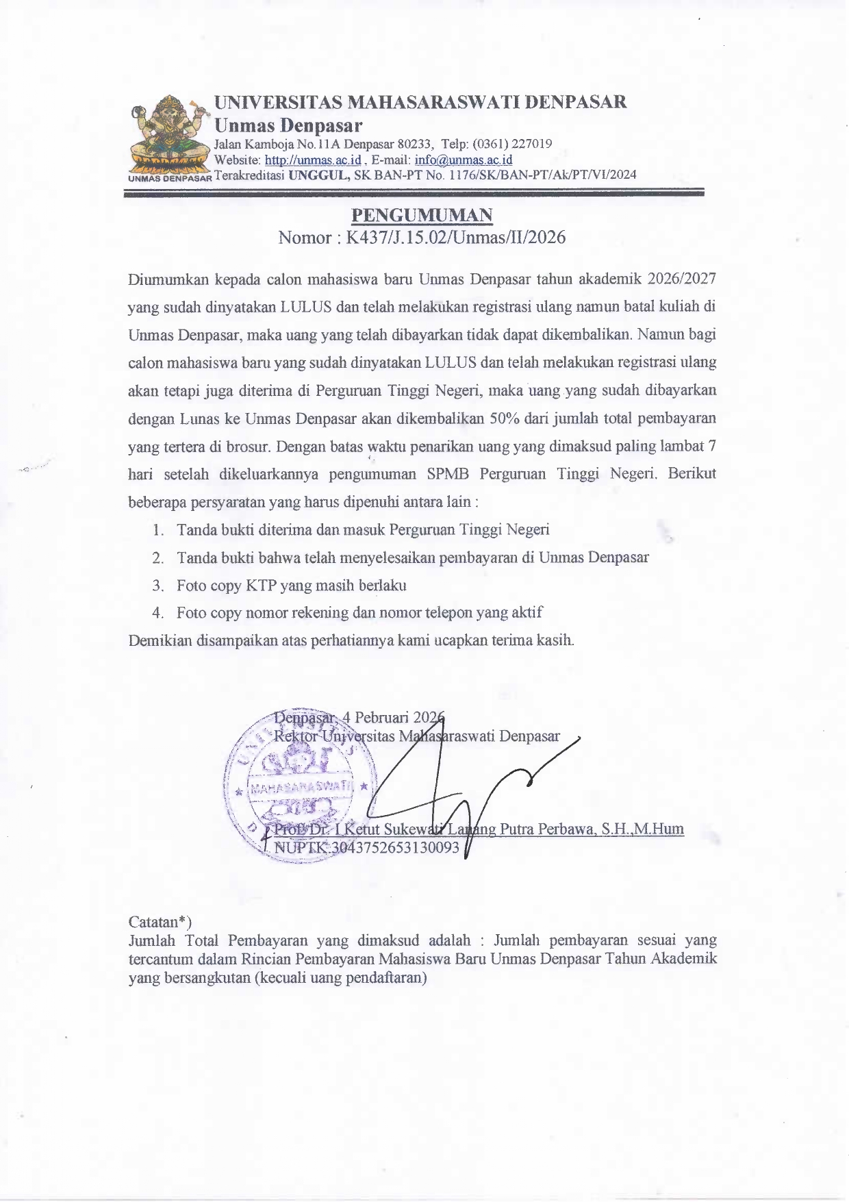 Diumumkan kepada calon mahasiswa baru Unmas Denpasar tahun akademik 2023/2024 yang sudah dinyatakan LULUS dan...